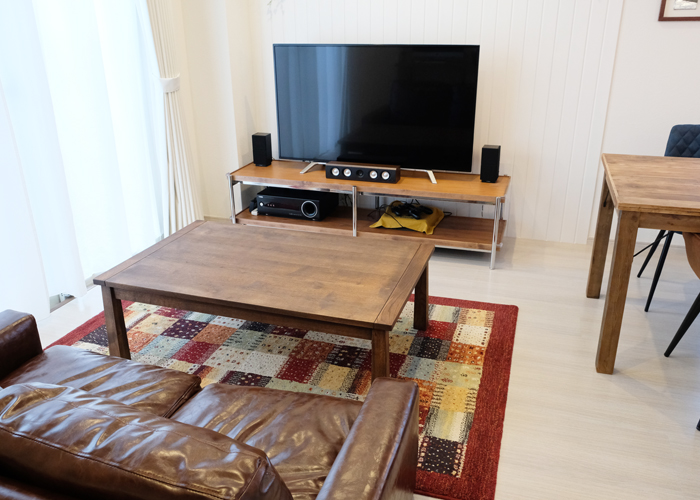テレビを設置する一面の壁を木でくみ上げて、印象的な空間を演出しました。照明も間接照明を利用しています。